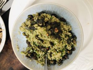 4.キヌアに3のグリーンソースを混ぜて、きのこと和える