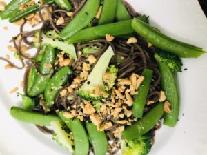 そばと野菜をお皿に盛り、好みでゴマソースをかけて食べる